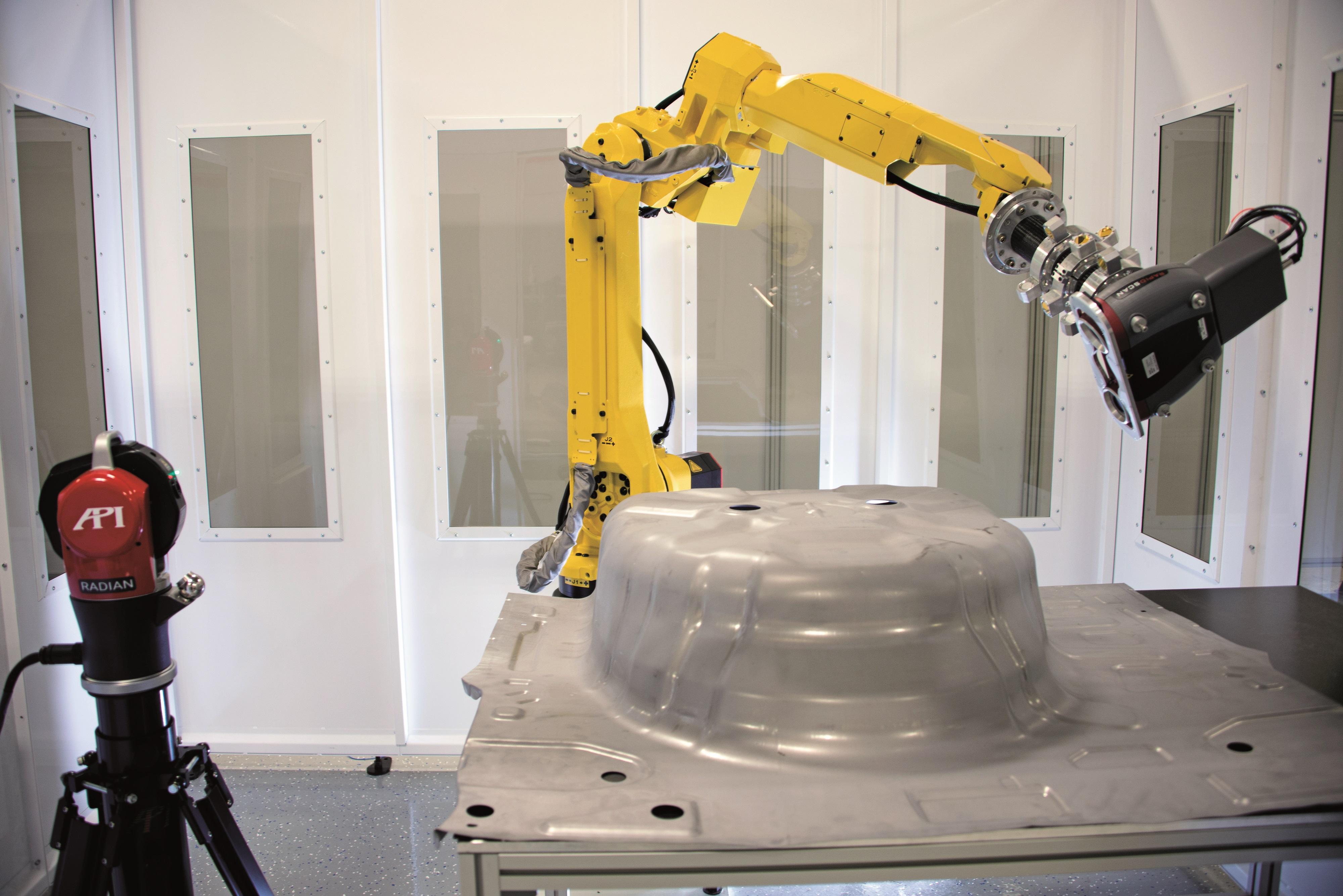 六、超高精度快速扫描测量。各式各样的扫描检测设备已经广泛应用于汽车制造行业。但是基于API激光跟踪仪测量系统定位的快速自动扫描解决方案(SFIS智能工厂检测系统),进一步提升了扫描检测手段在汽车制造行业的应用质量(图3)。SFIS智能工厂检测系统由API激光跟踪仪、Rapidscan快速扫描仪、工业机器人以及软件系统构成。检测时,将Rapidscan快速扫描仪固定在机器人的末端,在机器人运动并对工件进行扫描的同时,API激光跟踪仪会为机器人做实时定位指导。SFIS检测系统集激光跟踪仪的精准、扫描测头的快速,以及机器人的自动化优势于一体,为汽车制造行业中白车身的检测、部件CAD的比对、原型件的逆向工程等工作提供了性能更优、效率更高的解决方案。
