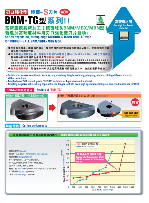 黛杰“镜面球刀BNM”它以世界上同类产品中最高精度著称,普通级的刀片圆弧精度高达±6微米已让其它厂家望尘莫及,而超精度级刀片亦是高达±2微米。由于刀片精度超群,故被加工工件表面质量极高,在相应的条件下,可加工出镜面效果,故被命名为“镜面球刀”,它的主要特点: