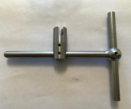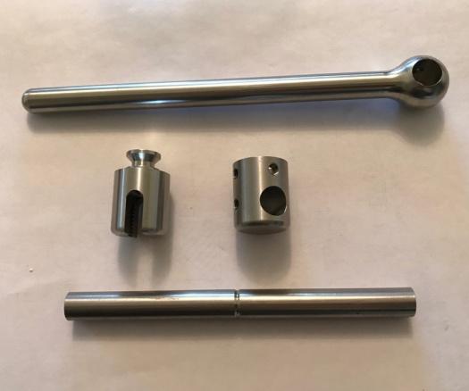 但是,7个部件中有一个部件确实给夫妇二人带来了不小的挑战。这个形似棒棒糖,由304不锈钢制成的7 in组件有一根直径为7/16 in(1 in≈0.025 m)的轴承。轴承一端是一个直径7/8 in的球体,球体上有一个通孔和一个更小的攻丝跨孔,用于固定穿过通孔的旋转组件(图1)。