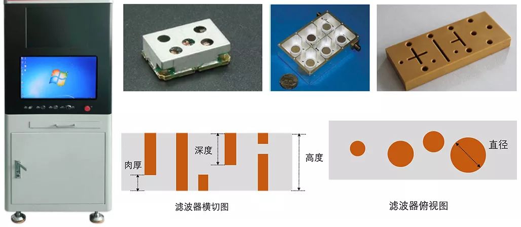 滤波器尺寸智能检测适用于各种材质的基站滤波器,包括金属/陶瓷/塑料,检测项目包括孔径大小、产品厚度和孔深等(如图)。此项方案的优势有:
