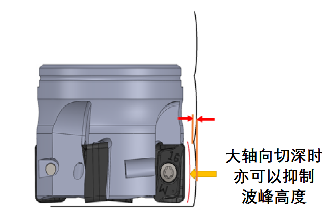 双面赛豹是实现轴向切深最大15 mm的机夹式方肩铣刀,通过高刚性、低抵抗的设计,不论侧壁还是平面,包括沟槽、倾斜、螺旋加工皆可胜任,适用范围极其广泛(图1)。另外,刀片的外周刃轨迹为大圆弧状,即使轴向切深大,也可以有效抑制波峰波谷,实现了侧壁垂直度仅有6 μm的高精度加工(图2)。刀片材质有耐崩性和耐磨性兼顾的【JC8050】,以及不论是一般钢材还是预硬钢,亦或是HRC50度的淬火钢,都有着优异表现的新材质【JC8118】。