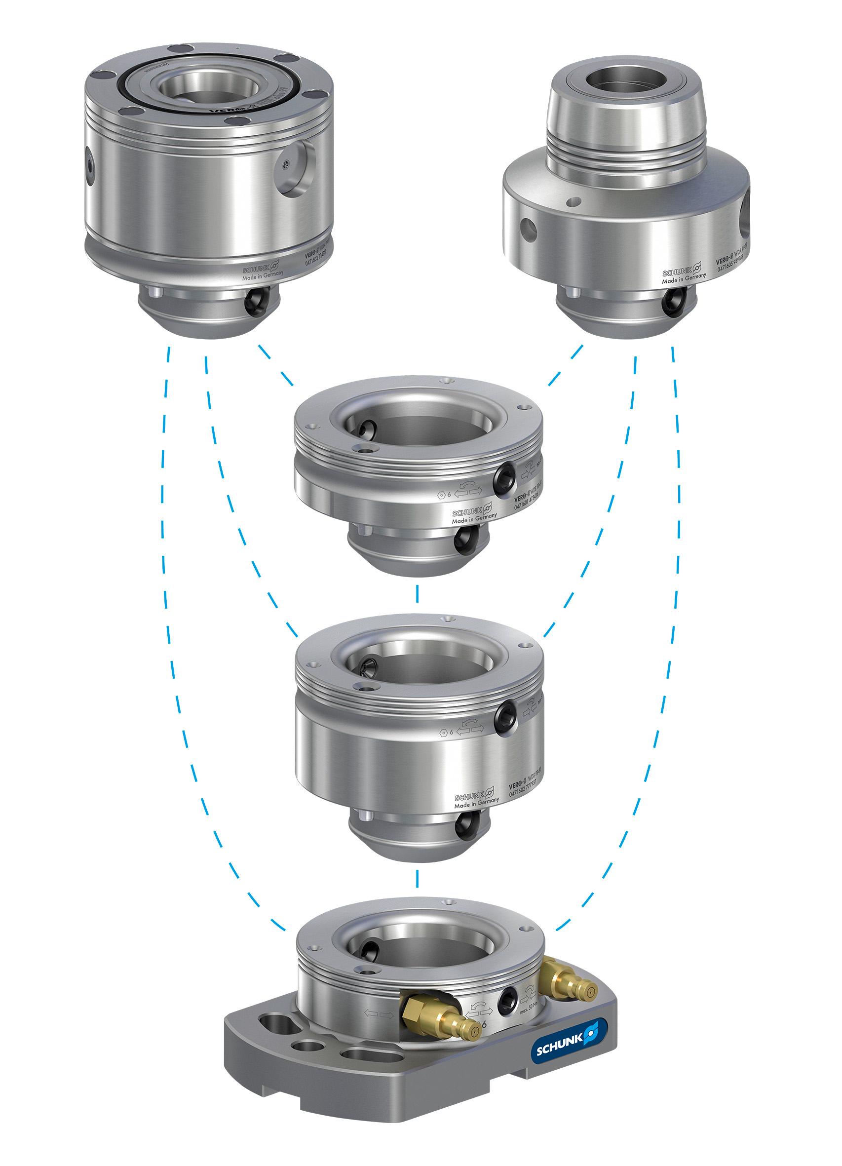 雄克的VERO-S零点快换系统与其他众多夹持装置整合,可创建适用于高效工件夹持的标准、模块化系统。雄克的专家根据不同的机床类型,研发出了一套能够简化模块选型的系统。该程序含有1000多个可能的组合。它包含了高效的高度拓展模块,从多面夹具塔、夹持托盘、气动和液压虎钳、卡盘、磁力夹持解决方案、车床和自动机床上料用模块。模块系列甚至包括高精度精加工或高夹持要求任务所用的独立夹持装置,该系统程序具有高度兼容性,可广泛适用于不同加工应用。