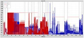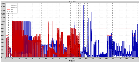 仿真优化的结果如图2和图3所示。在图2中,原始程序所仿真出的切削力为蓝色曲线,优化程序所仿真出的力为红色曲线,从图中可以看出,原始程序(蓝色曲线表示)所用加工时间为197min,而优化后程序(红色曲线表示)所用的加工时间为112min,时间效率上提高了43%。