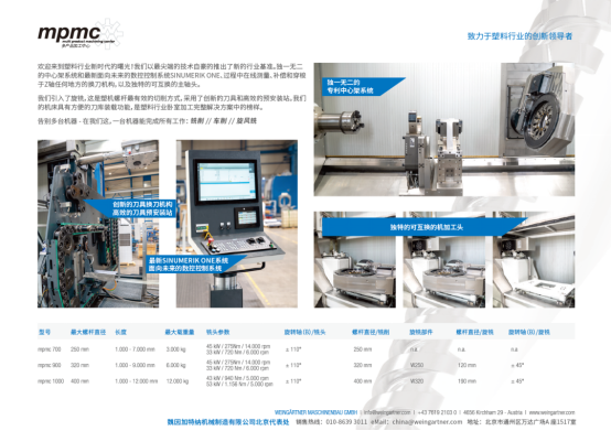 关于魏因加特纳机械制造有限公司:(Weingärtner Maschinenbau GmbH)成立于1965年,总部位于奥地利格蒙登基尔夏姆,如今已走过近60年的发展历程。集团公司在全球拥有700多名员工,拥有独特的旋风铣技术,成为车铣复合加工中心的重要制造商之一。作为一家独具竞争力的公司,魏因加特纳始终专注于生产极高灵活性和高精度的多产品加工中心。依托多年的制造经验,得益于全球各地可靠的合作伙伴,魏因加特纳已能够为航空制造业、能源业、油气行业、塑机行业及通用加工业等提供完整加工解决方案。凭借富有远见的战略规划和领先的创新能力,已成为全球值得信赖的机床工具品牌。
