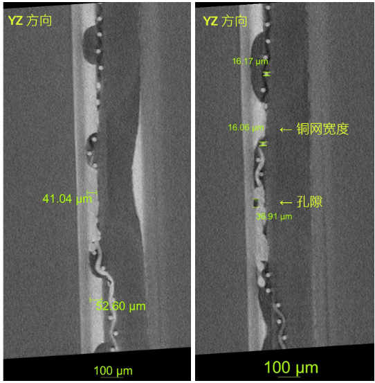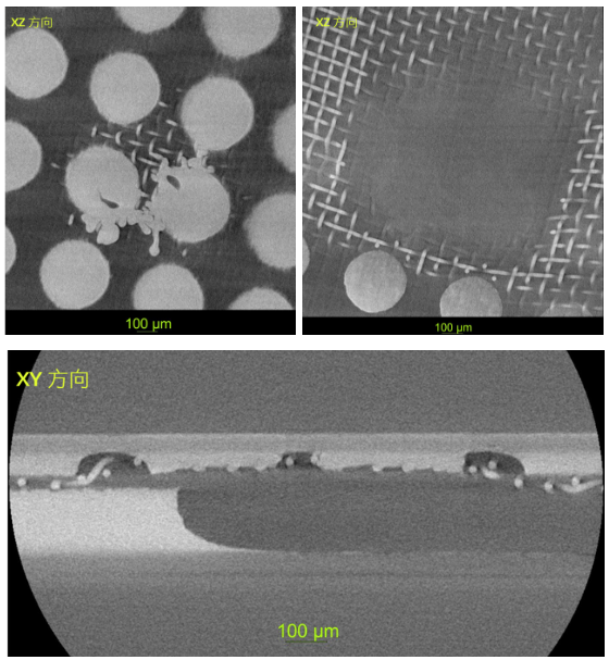 1.5μm体素分辨率对凹陷处铜网扫描成像,可观察到铜柱和铜网变形、粘连。