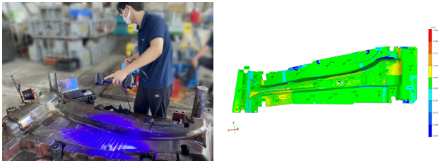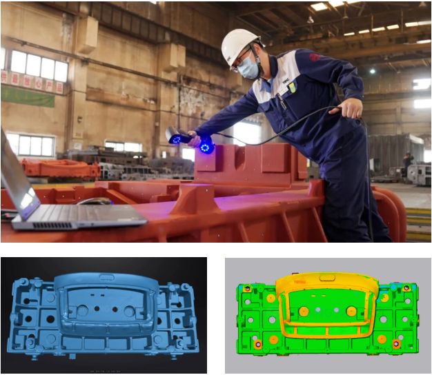 车身覆盖件多由冲压模具制作成型,而模具底座则是确保模具在加工或使用过程中的稳定性和精度的关键部分。不少模具底座尺寸较大,通过先临天远手持式三维扫描仪进行扫描,可快速获取其完整准确的三维数据,据此进行质量评估。