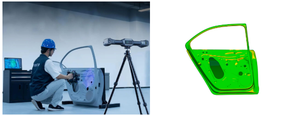 在汽车分总成件如四门两盖的焊接过程中,易出现孔位偏移、焊接变形等问题,先临天远跟踪式三维扫描系统可快速扫描焊装后的车门等部件,将扫描数据与标准CAD模型精准比对,直观呈现圆孔、车门轮廓点等关键位置的尺寸及形面偏差。