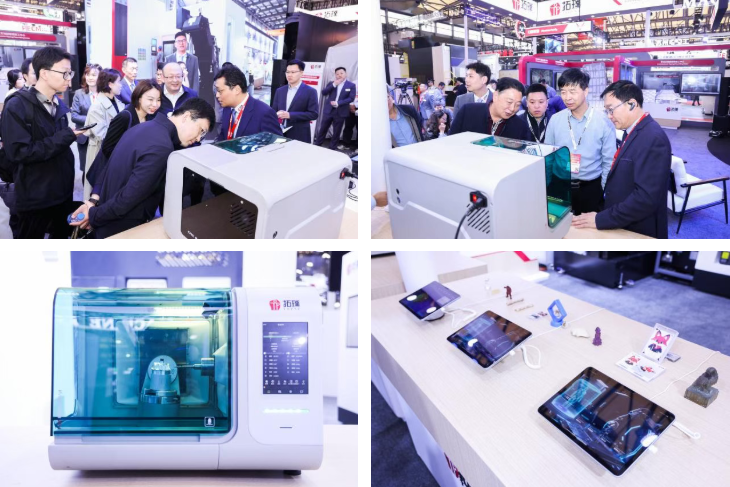 桌面机展区摆放着iMachine 24 Max,现场展示了由桌面五轴机制作出的精美手办,轻松有趣,吸引了观众和媒体朋友拍照打卡,现场互动氛围热烈。这台小设备虽然体积小巧,却具备完整的五轴联动能力,是教学、研发和小批量精密加工的利器。