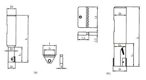 机夹螺纹铣刀适用于较大直径(如D>25mm)的螺纹加工。其特点是刀片易于制造,价格较低,有的螺纹刀片可双面切削,但抗冲击性能较整体螺纹铣刀稍差。因此,该刀具常推荐用于加工铝合金材料。图3 所示为两种机夹螺纹铣刀及刀片。图3a为机夹单刃螺纹铣刀及三角双面刀片,图 3b为机夹双刃螺纹铣刀及矩形双面刀片。