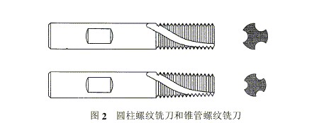 圆柱螺纹铣刀的外形很像是圆柱立铣刀与螺纹丝锥的结合体(见图2上,图2下为锥管螺纹铣刀),但它的螺纹切削刃与丝锥不同,刀具上无螺旋升程,加工中的螺旋升程靠机床运动实现。由于这种特殊结构,使该刀具既可加工右旋螺纹,也可加工左旋螺纹,但不适用于较大螺距螺纹的加工。