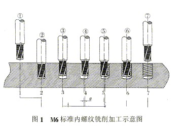 图1所示为M6标准内螺纹的铣削加工实例。工件材料:铝合金;刀具:硬质合金螺纹钻铣刀;螺纹深度:10mm;铣刀转速:2,000r/min;切削速度:314m/min; 钻削进给量:0.25mm/min;铣削进给量: 0.06mm/齿;加工时间:每孔1.8s。