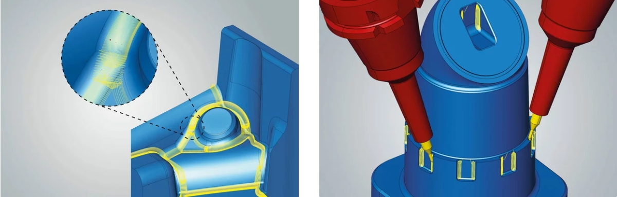 在 3D 加工(图像)和 5 轴加工中,新的清根检测算法确保系统自动充分检测所有残料区域。