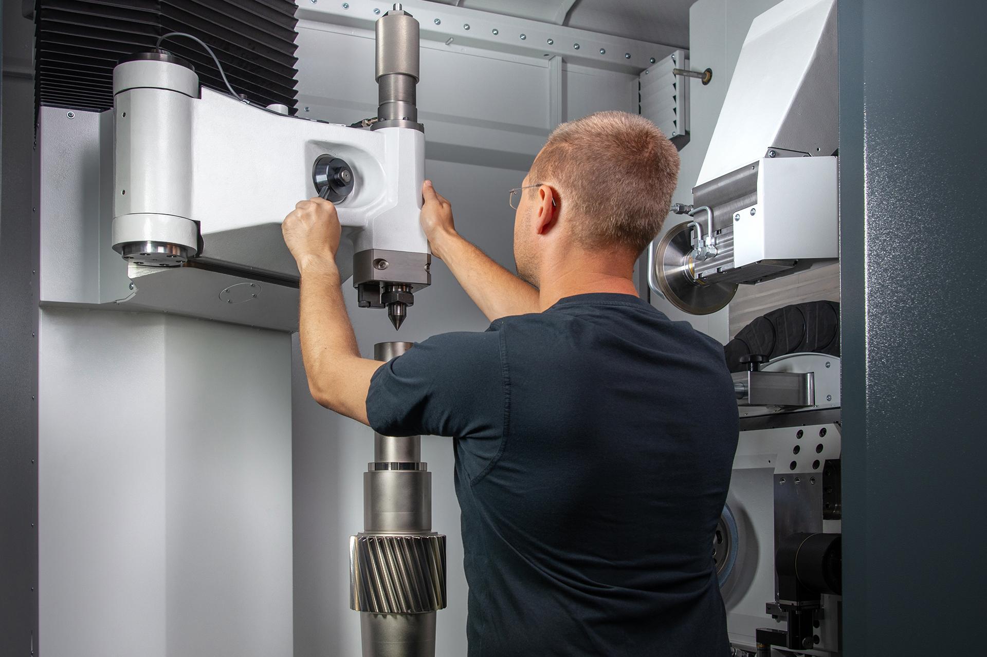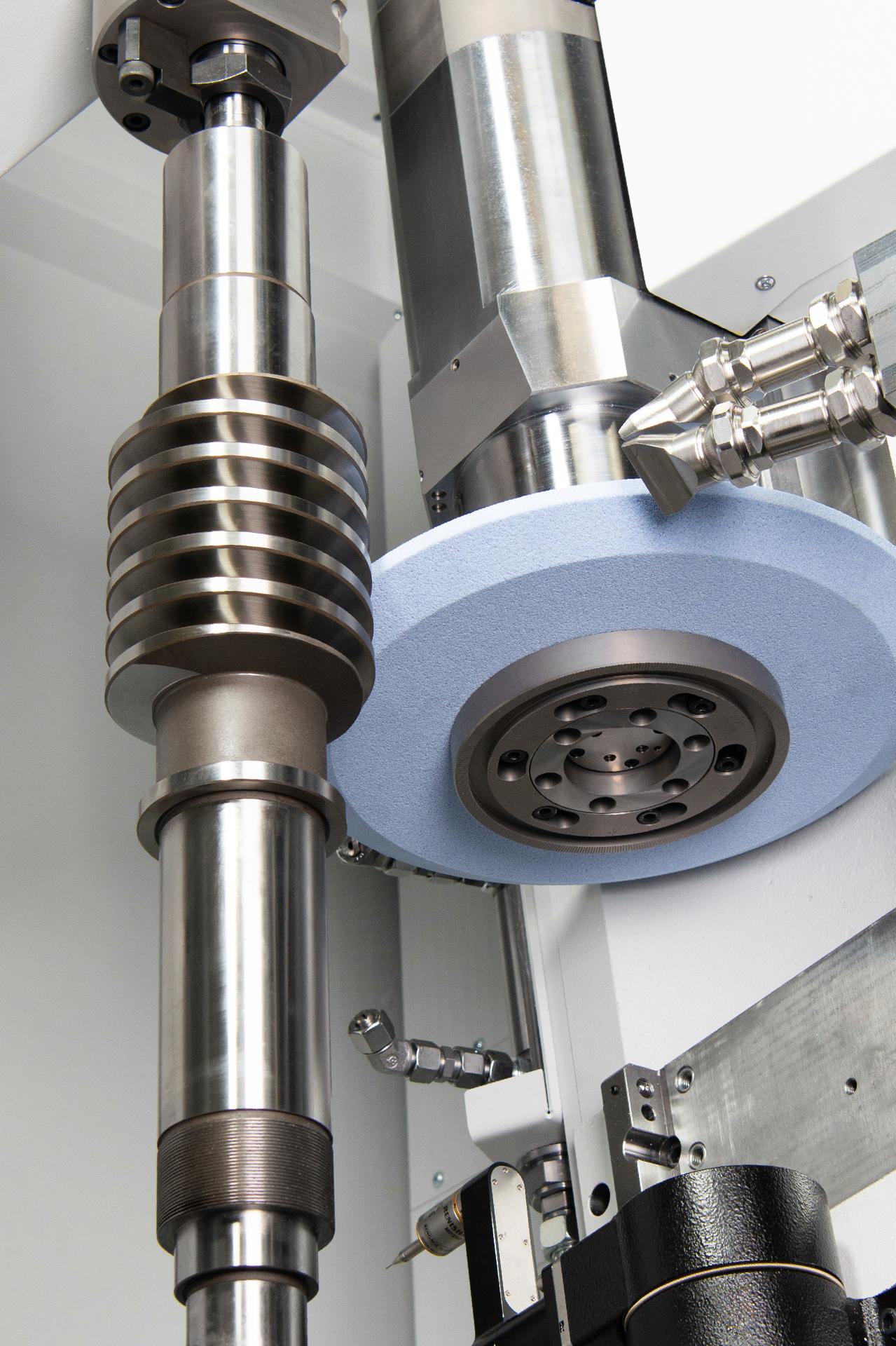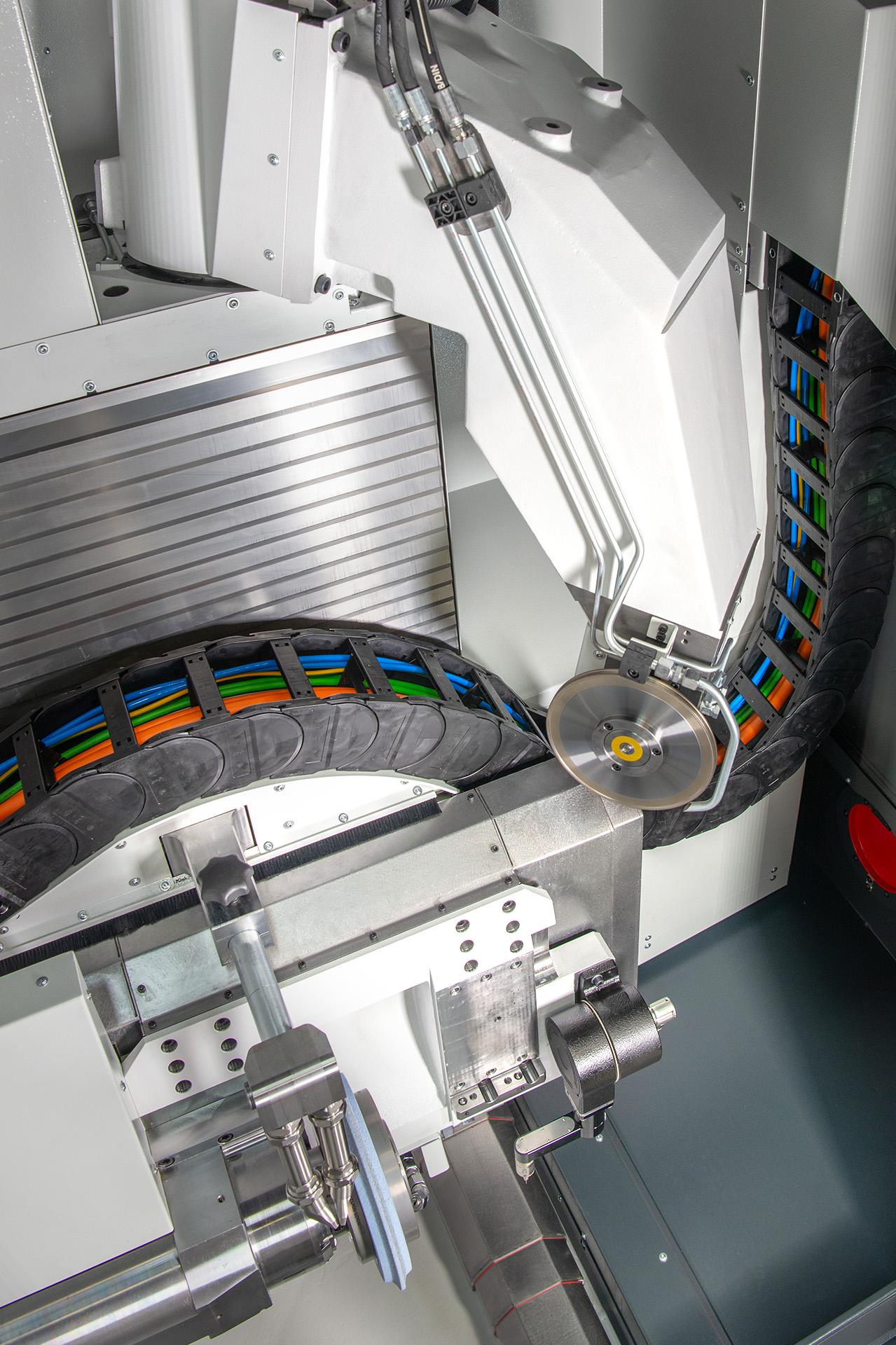 KNG 5P expert 具有出色的装配便利性。更换修整滚轮时,直接驱动的修整主轴可旋转到符合人体工程学的位置。因此,修整刀具可以在机床外面轻松更换。优化后的支座具有 850 mm 的行程,上面安装的摆动式尾座具有可无级调节的尖端压力(最高 2,000 N), 显著扩展了尖端夹紧的应用范围。