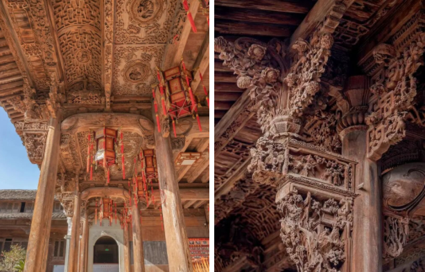 精湛的雕刻艺术:花厅正厅装饰尤为考究,梁、檩、牛腿、雀替、檐枋、船篷轩、花篮拱及轩顶等处均雕饰精美。这些精美构件形态复杂、纹饰细腻,对三维采集设备的细节还原能力提出了极高要求。