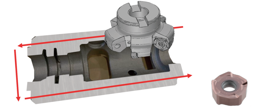 在某大型铸铁件粗加工案例中,工件为铸件毛坯,表面存在黑皮、沙眼且加工余量不均,对刀具的抗冲击能力提出极高要求。原用刀具为保证加工稳定,仅能采用 1.5 mm 的轴向切深,加工效率长期处于低位。引入黛杰 PNS-Reborn 五角魔刀(刀盘 φ100,搭配 KM 铸件专用断屑槽刀片及对应涂层材质)后,加工工况得到显著改善:在主轴转速、进给速度基本不变的情况下,轴向切深直接提升至 4 mm,切屑排出量从 240 cm³/min 跃升至 640 cm³/min,加工效率达到原刀具的 2.7 倍。更重要的是,整道加工工序中,刀具未出现异常磨损或崩刃情况,成功抵御了铸件毛坯恶劣工况的冲击,充分验证了其优异的加工稳定性。