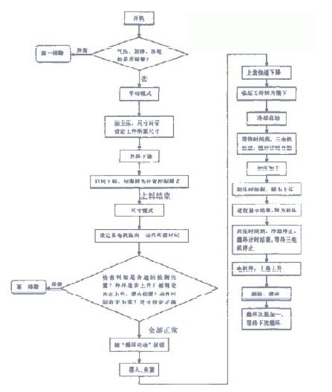 根据机床动作的需求,将操作分为手动、时间、 自动、修整 四种工作模式。其 中手动模式主要进行机床的动作调整,设有各动作所需的按钮;时间模式是设定各压力阶段的时间,自动转换相应压力的模式;尺寸模式与时间模式基本相同,只在主压时利用尺寸控制仪来控制研磨量;修整模式是修整砂轮时专用。在触摸屏开机画面中点击所需模式即可进入各自独立模式下的操作。