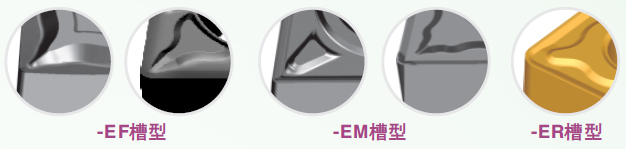 公司针对不锈钢材料的精加工、半精加工和粗加工而设计了-EF、-EM、-ER槽型。-EF槽型刃口锋利,切削轻快,加工时表面质量优良,适合不锈钢的精加工。-EM槽型加强了切削刃的抗冲击性,适用于不锈钢等粘性材料的半精加工。-ER槽型特殊的双前角宽棱带设计,有效降低切削阻力,减轻沟槽磨损,适用于不锈钢的粗加工。