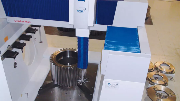 下一个步骤是磨削那些经过硬化的齿轮。磨削运行期间,首个零件会以手工方式装载进直接位于车间的 CenterMax。一旦质量合格,工序确定,即可开始大批量生产。在批量生产中,一个自动化的龙门机器人会将磨削后的零件输送到下一个质量检测站。在那里,另一台CenterMax 运行着。接着,龙门机器人将齿轮输送到不同的处理工位,齿轮将被清洁和使用巴克豪森噪声法完成回火表面检测。再运行一次后,质量检测以及CenterMax便完成了任务。