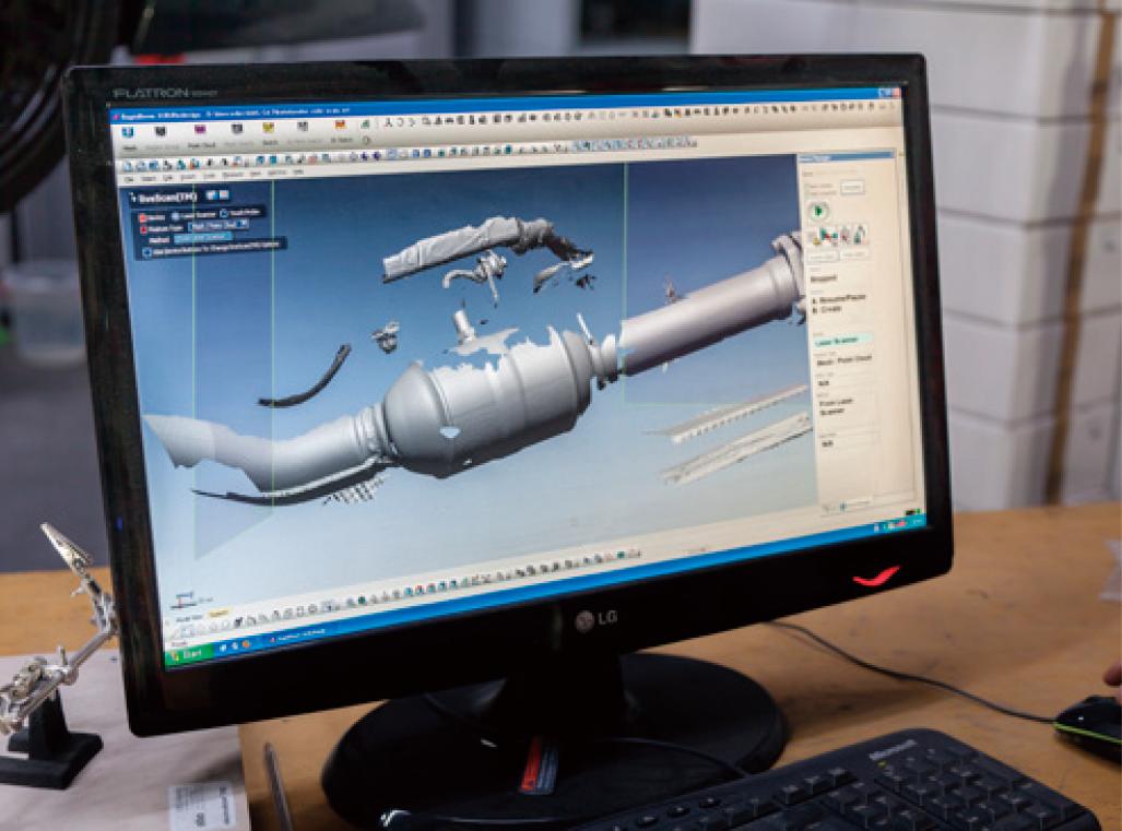 排气系统开发过程通常从使用3D扫描仪扫描车辆底盘开始。生成的点云数据为CAD系统提供必要的关键数据,用于定义精确的连接点并确定可用于安装的空间。随后进行排气系统设计,重点关注独特声学体验。