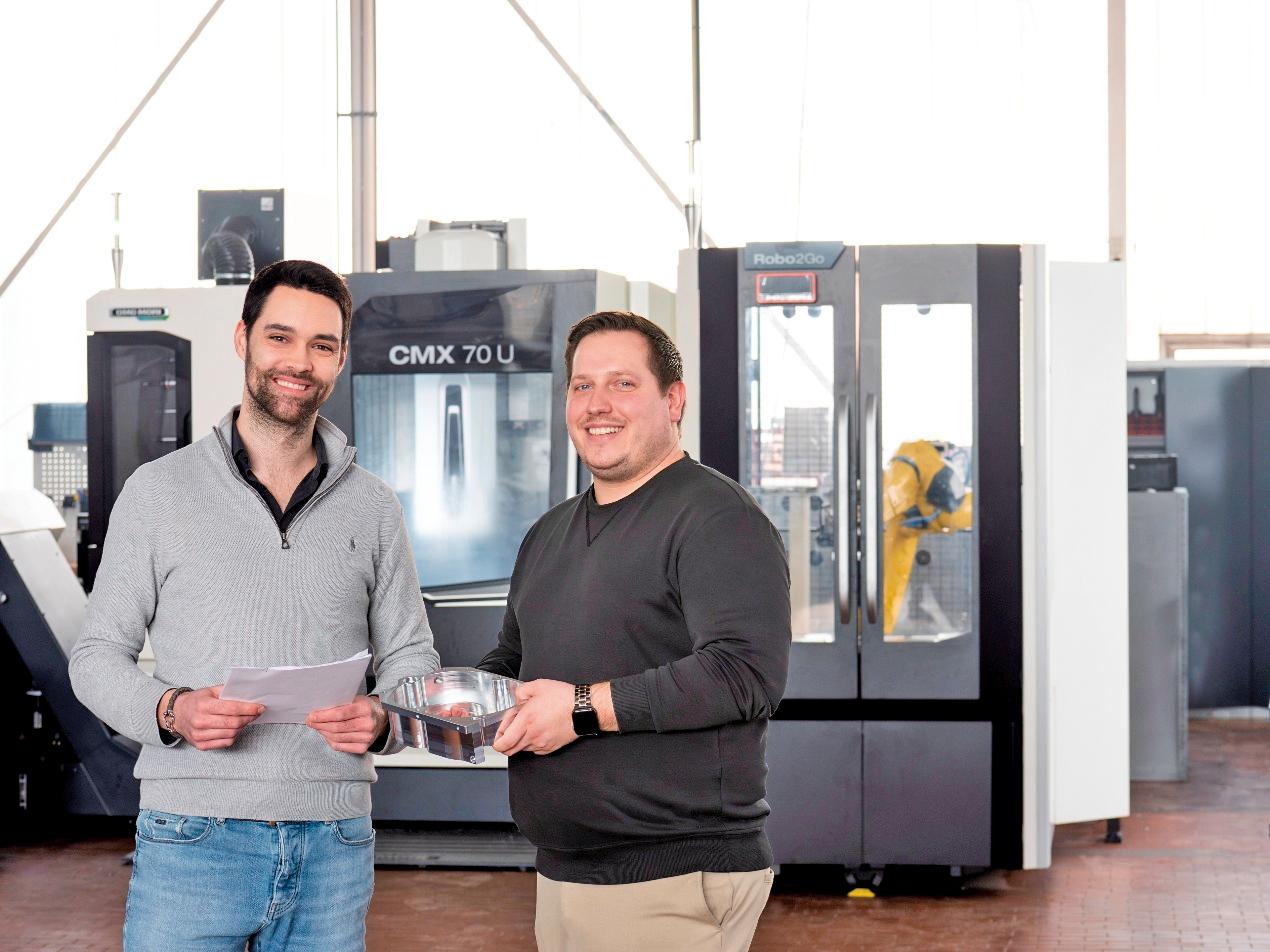 图2 MERZ tronic总经理Florian Merz和生产经理Michael Schmid在加装了Robo2Go机器人工件搬运系统的CMX 70 U铣削加工中心前