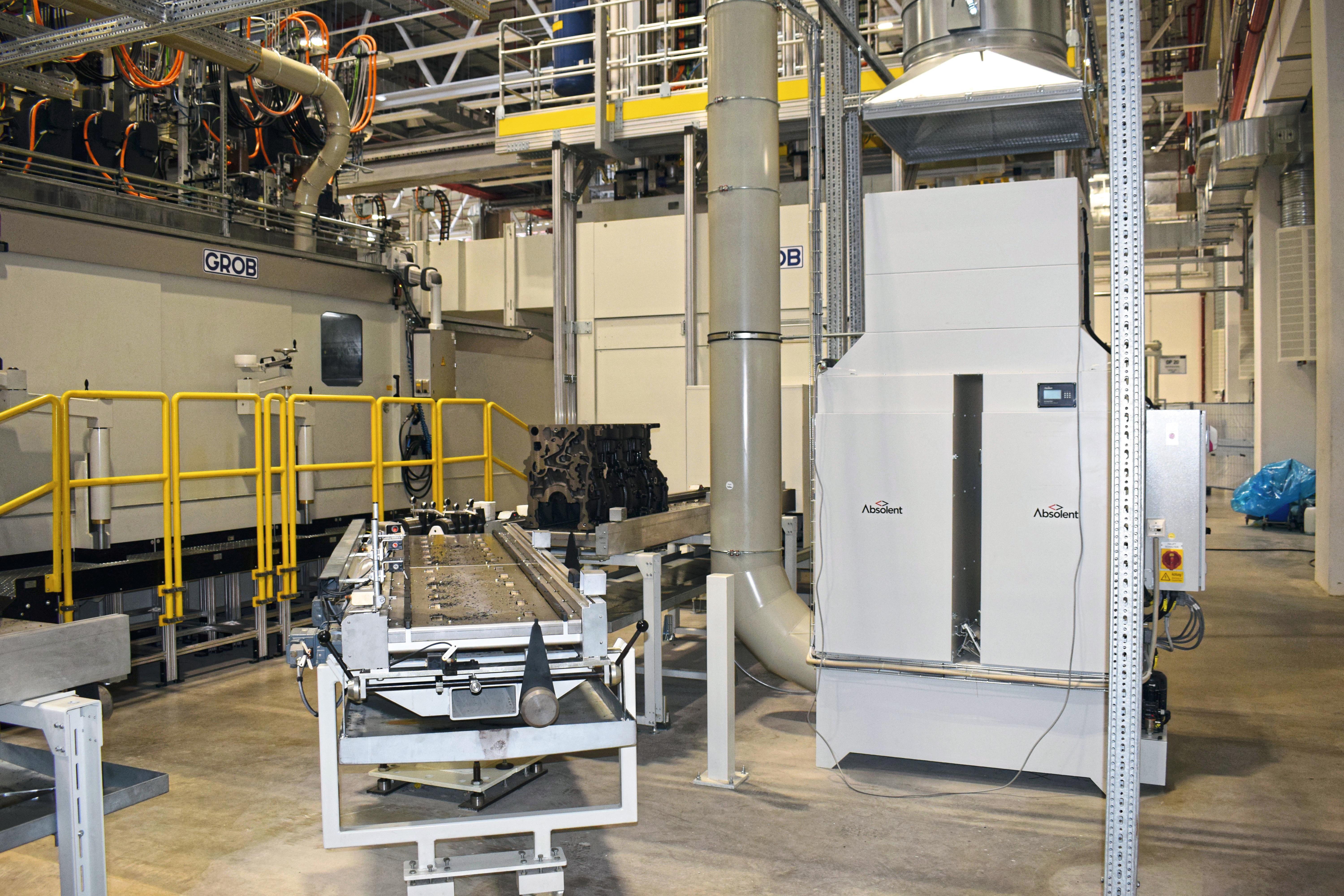 最后,在通风换气系统设计中,不同加工工艺所产生的气溶胶负荷是关键考量因素。应Grob公司的要求,Absolent公司为其提供了整套定制化解决方案:该通风系统采用差异化过滤设计,针对不同生产环节所产生的油雾与乳液雾进行分别处理。这一设计优化了纽伦堡工厂的通风过滤流程,从而高效确保了生产环境的清洁度。