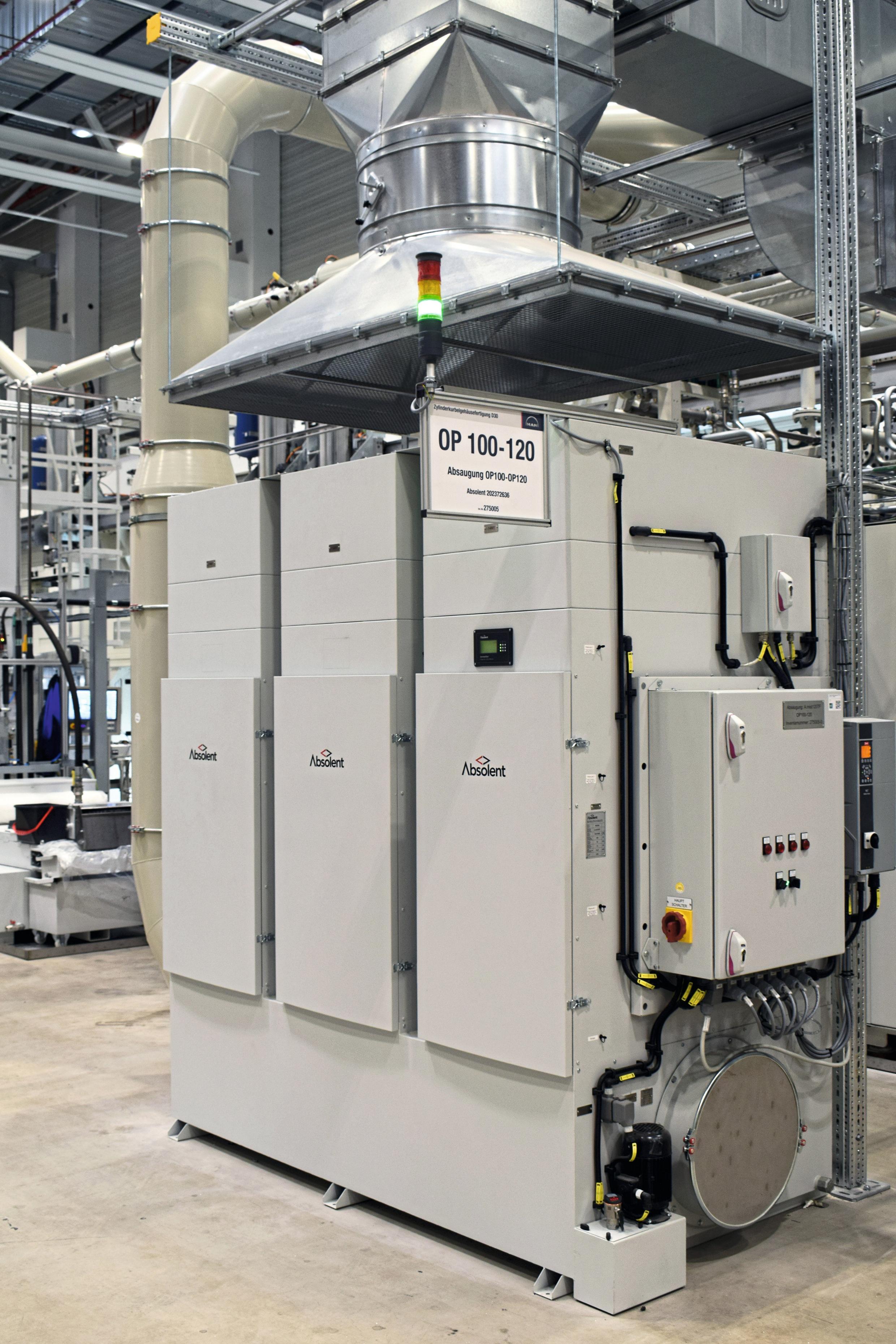 而在传统湿加工(KSS冷却润滑)过程中,MAN公司则采用了Absolent另一款Mist系列过滤设备,专为过滤常见的乳液雾设计。针对不同工艺的过滤需求,Absolent公司排尘技术专家Hartmut Enderle先生解释道:“我们无法用单一过滤器完成所有任务,因此设备可根据被过滤介质的差异,灵活调整过滤材料,确保其适应具体应用场景。这套系统在三班制连续生产条件下,设计使用寿命可达三年。”
