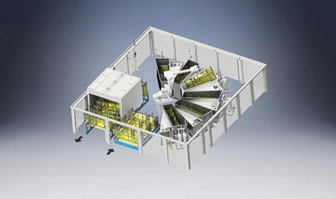 在小批量试制完成后,MTM和 MTO便着手进行工艺设计、设备技术的构造和建造。机器人被布置在中心位置,以便能高效地引导其通过各介质槽。沿1个半圆形布置了6个工艺槽。另一半则承载控制元件。这种布局已被证明特别紧凑。完全封闭的设备直径仅约6 m。机器人可将尺寸达 700 mm×1100 mm×300 mm的部件运送通过各工艺槽。