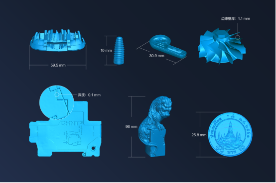 4μm的精度可以保证测量尺寸的精准性,而卓越的细节捕捉能力则可完整采集工件微观特征,保证数据的完整度。OptimScan Q12 HD搭载1230万像素高清相机,小范围扫描模式下平均点距可达0.02mm,能够完整呈现如3C电子注塑件Boss柱、微型零部件、精密叶轮边缘轮廓等复杂构件的微细几何特征,为后续的检测、逆向建模等应用提供完整的三维数据。